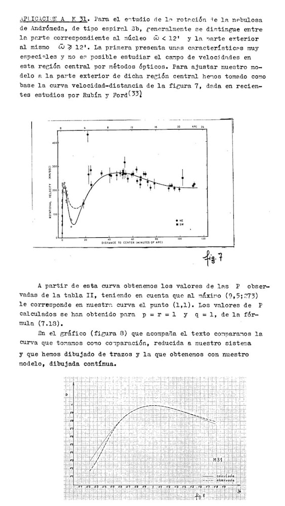 Figura 4. Extracto de su tesis doctoral, defendida en 1971 en la Universidad de Barcelona. En la fig. 8 de la tesis se muestra el ajuste de sus modelos a los datos obtenidos por Vera Rubin de la galaxia de Andrómeda. Tesis digitalizada y consultable en el depósito TDX