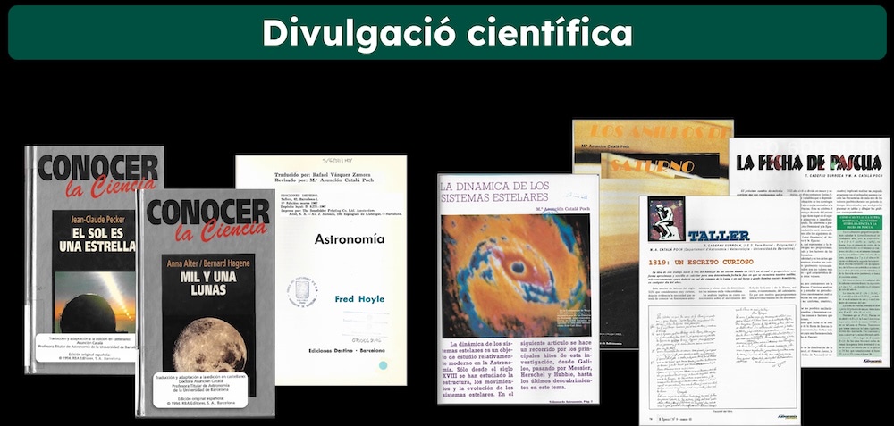 En su haber encontramos casi un centenar de publicaciones, de temática muy variada y dirigidas a distintos públicos, libros de texto, artículos en revistas sobre el sistema solar, sobre dinámica de sistemas estelares, sobre astronáutica, de astronomía árabe y sobre la enseñanza de la astronomía, entre otros. Además de artículos de divulgación, traducciones y revisiones de libros (ver Figura 6). M. Assumpció se mostraba satisfecha de haber hecho lo que más le gustaba: enseñar y observar. «Mi dedicación a la docencia a veces ha ido en detrimento de mi dedicación a la investigación, pero he dado mi tiempo por muy bien empleado».