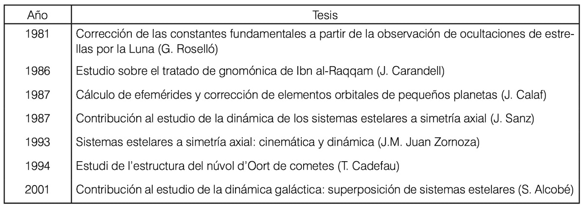 En 1971 defiende su tesis doctoral en el campo de la dinámica galáctica: “Contribución al estudio de la dinámica de los sistemas estelares a simetría cilíndrica” donde, bajo la dirección del Dr. Juan J. de Orús Navarro, realizó una contribución a la Teoría de Chandrasekhar sobre la dinámica de los sistemas estelares analizando el movimiento de las estrellas en el entorno solar mediante la resolución de ecuaciones diferenciales que vinculan potencial y campo de distribución de velocidades. Ajustó sus modelos a las curvas de rotación de la nuestra galaxia y de M31 (ver Figura 4), datos estos últimos obtenidos por Vera Rubin. Fue directora de 7 tesis doctorales (ver Tabla 1) dedicadas tres de ellas al estudio del movimiento orbital de objetos del sistema solar, otras tres a la cinemática y dinámica de la componente estelar del disco galáctico y, una séptima al estudio de los relojes de Sol en la astronomía árabe. De nuevo, estos trabajos muestran la faceta transversal y holística de su carrera investigadora. Desde 1979 hasta 1994 fue representante española en la Comisión 46 de la Unión Astronómica Internacional (UAI), dedicada a la enseñanza de la astronomía. También formó parte de la European Astronomical Society desde su fundación en 1990 y fue miembro numerario de la Sociedad Española de Astronomía desde 1994.