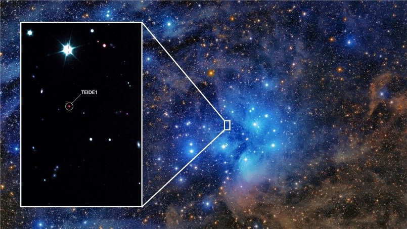 El objeto fue hallado en el cúmulo estelar de las Pléyades (Fig. 1), un cúmulo estelar joven y cercano, ideal para este tipo de búsqueda. A lo largo de 1994, realizamos una exploración fotométrica con el telescopio IAC80 en el Observatorio del Teide y posteriormente un seguimiento espectroscópico con el 2.5 m INT y el 4.2m WHT desde el Roque de los Muchachos (La Palma). Los datos que obtuvimos con estos telescopios mostraron que un objeto en la región central del cúmulo de las Pléyades, que denominamos Teide Pléyades 1, tenía una temperatura y luminosidad demasiado pequeñas para mantener la fusión de hidrógeno de forma estable, situándole claramente en el dominio subestelar. Su pertenencia al cúmulo de las Pléyades, que pudimos establecer también por su movimiento propio y velocidad, permitía conocer su edad, composición química y distancia, parámetros clave para estimar su masa en unas 55 veces la de Júpiter. Claramente insuficiente para producir la fusión de hidrógeno. Por primera vez se demostró que las enanas marrones existen en la naturaleza más allá de las ambigüedades que presentaban otros candidatos previos y que finalmente resultaron ser estrellas de muy baja masa. Teide 1 verificaba todos los criterios para ser considerada una enana marrón.