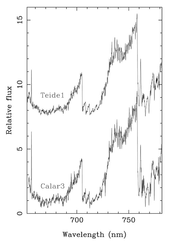 Antes de Teide 1, el mayor obstáculo para confirmar enanas marrones era distinguirlas de las estrellas de muy baja masa. Ambos tipos de objetos pueden tener atmósferas relativamente frías y ser poco luminosos, pero solo las estrellas logran mantener fusión nuclear de hidrógeno. Para resolverlo, habíamos propuesto un método espectroscópico conocido como la “prueba del litio” (Rebolo, Martín & Magazzù 1992, ApJ Lett. 389, L83). El litio es un elemento frágil que se destruye fácilmente en el interior estelar a temperaturas superiores a unos 2,5 millones de Kelvin. Una estrella, incluso la más pequeña, quema su litio al poco de formarse, mientras que una enana marrón de menos de 60 veces la masa de Jupiter —incapaz de alcanzar esas temperaturas— lo conserva prácticamente intacto. Por tanto, detectar litio en el espectro de un objeto frío es una prueba inequívoca de que nunca ha iniciado la fusión del hidrógeno. Este método se convirtió en la norma para identificar enanas marrones. Fue aplicado con éxito a Teide 1 y también a Calar 3 (ver Fig. 2 y Fig. 3) la segunda enana marrón que descubrimos unos meses después, esta vez desde el Observatorio hispano-alemán de Calar Alto (Almería) confirmando en Noviembre de 1995 la naturaleza subestelar de ambas con el telescopio Keck de 10m que recién había iniciado su operación científica en Hawaii (Rebolo et al. 1996, ApJ Lett. 469, L53). Posteriormente, la técnica de medir litio fue refinada y extendida consiguiéndose obtener abundancias de litio de forma casi rutinaria en enanas marrones del campo como LP 944-20 (Pavlenko et al. A&A 2000, 355, 245; MNRAS 2007, 380, 1285) y de cúmulos estelares de diversas edades, incluyendo el cúmulo de las Híades (Martín et al. ApJ 2018, 856, 40), lo que llegó incluso a proporcionar una nueva manera de determinar edades para cúmulos y asociaciones estelares.