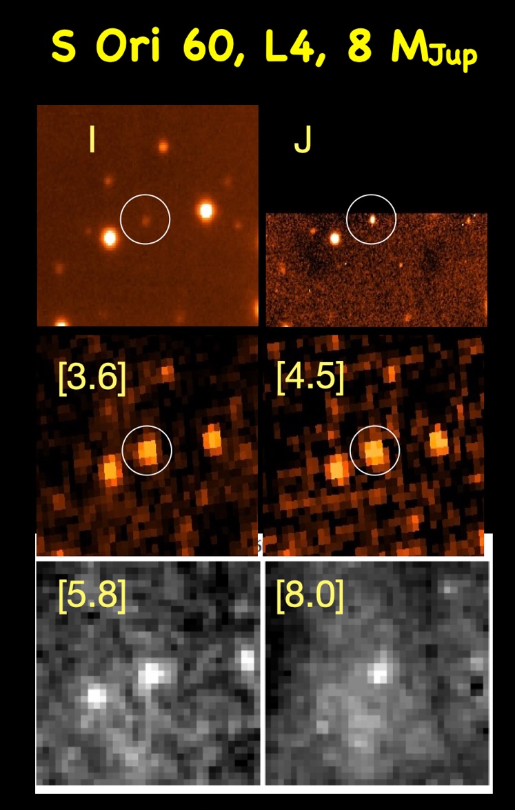 Figura 5. Imágenes de S Ori 60, un objeto con masa estimada 8 MJup no ligado a estrellas, situado en el cúmulo sigma de Orión. Su tipo espectral es L4. Se presentan imágenes en bandas I, J, 3.6, 4.5, 5.8 y 8.0 micras, mostrando el considerable incremento de flujo en las bandas del infarrojo medio.