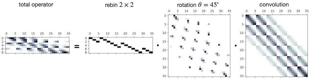 Estos operadores lineales son matrices en las que cada fila representa un punto degradado en la salida y cada columna representa cómo este punto está afectado por los parámetros del resto del campo de visión. La Ilustración 3 muestra varios ejemplos de estos operadores y cómo pueden combinarse con un simple producto matricial. El principal efecto de introducir operadores que acoplan la solución de diferentes puntos es que la inversión se convierte en un problema global, y las correcciones deben calcularse de forma simultánea para todo el campo.