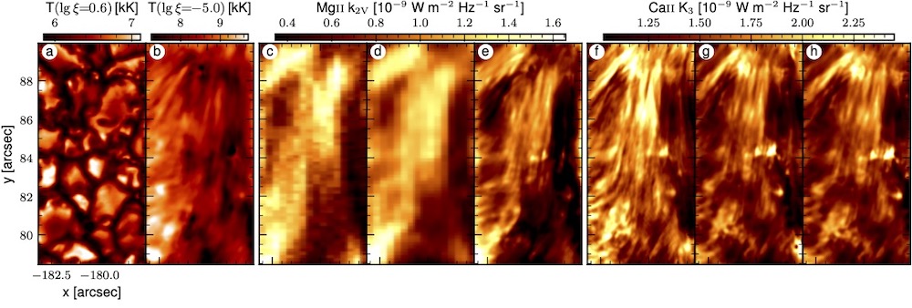 Lidiar con estos sistemas requiere un esfuerzo titánico, tanto a la hora de construirlos como de resolverlos, pero tiene su recompensa como se desprende del panel de la derecha de la Ilustración 2. Para su obtención, hemos realizado una inversión multi-resolución en la que hemos incluido en el proceso de modelado la degradación de cada región espectral, incluyendo la PSF del telescopio de IRIS. La mejora en los modelos ajustados es, a nuestro parecer, impresionante, siendo esta nueva inversión, capaz de recuperar las estructuras de pequeña escala que la inversión tradicional (panel central) es incapaz de resolver. De hecho, una vez que tenemos el modelo final, podemos sintetizar el espectro en todas las ventanas espectrales sin incluir los procesos de degradado. Por tanto, este tipo de reconstrucción en el que incluimos la PSF puede entenderse como una de-convolución de los datos a través de un modelo de atmósfera estelar, dado que el modelo ha sido derivado compensando el efecto de la PSF. La ventaja es que los datos sintéticos no contienen el ruido de la observación (aunque la reconstrucción del modelo sí está afectada por el ruido). La ilustración 4 muestra resultados de una inversión con datos reales de un grupo de datos adquirido con IRIS y con el SST. En este caso, los datos de Mg II k tienen una resolución (panel c) mucho más baja que los del resto de líneas (panel f).