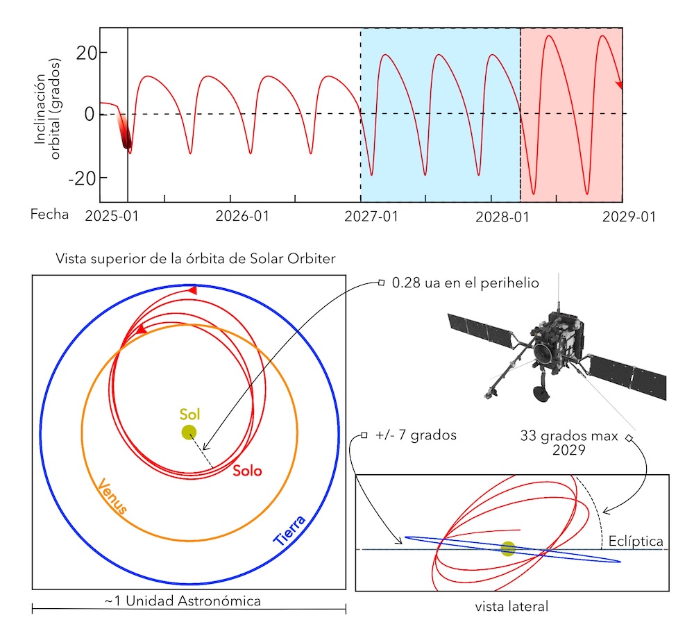 La inclinación orbital de Solar Orbiter seguirá aumentando en los próximos años (véase la Figura 1), lo que permitirá observaciones aún más detalladas a partir de 2028, cuando la nave alcance latitudes de hasta 33 grados sobre la eclíptica. Durante ese período, el instrumento SO/PHI continuará siendo clave en estas campañas de observación y proporcionará datos sin precedentes sobre la estructura y evolución del campo magnético polar. Hasta la fecha, la misión se encuentra en un estado de funcionamiento excelente a pesar de los entornos tan agresivos a los que está sometida debido a su cercanía al Sol. Toda la instrumentación a bordo, incluidos los telescopios de disco completo y de alta resolución, está actualmente operativa y acumula observaciones científicas de gran valor.