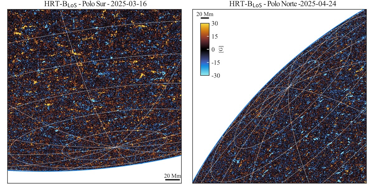 Al dirigir la mirada hacia los polos, se aprecia que no existe mucha actividad magnética, aunque se pueden distinguir señales que corresponden a la presencia de concentraciones de campo fuerte, las cuales delinean la localización de los flujos convectivos supergranulares presentes justo debajo de la superficie solar. Dichas concentraciones muestran una polaridad dominante: positiva (roja) en el sur y negativa (azul) en el norte, alineadas con el signo del campo magnético global del Sol. El cambio de signo que se produjo durante el máximo del ciclo solar 25, alrededor de 2024.