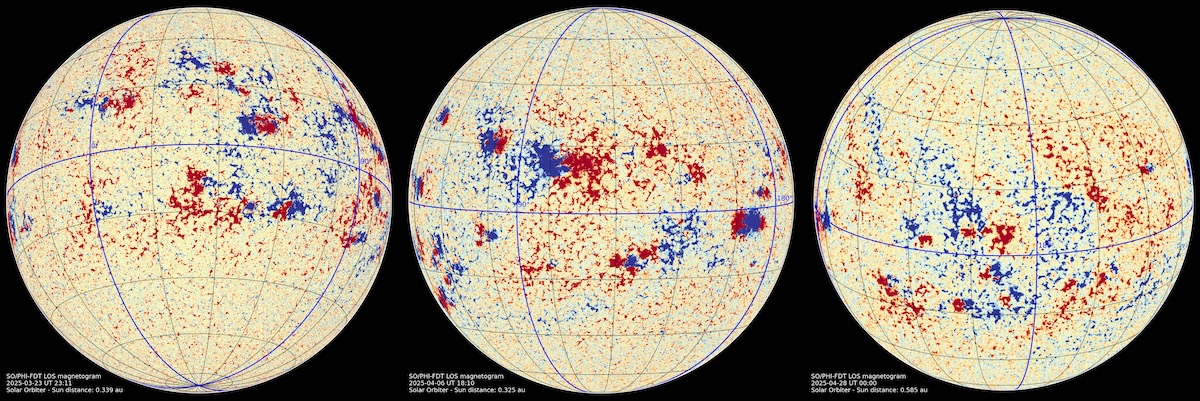 Figura 3. Imágenes de la componente longitudinal del campo magnético fotosférico, saturadas en ± 20 G, obtenidas con el telescopio de disco completo de SO/PHI durante la campaña de observación de marzo de 2025. Los tres paneles muestran, por orden, el polo sur, la zona ecuatorial y el polo norte, correspondientes a los máximos de latitud alcanzados por la misión respecto al plano de la eclíptica.