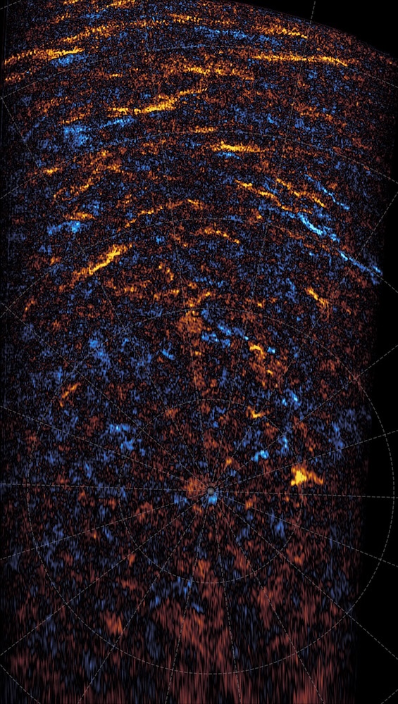 Los mapas obtenidos con el FDT muestran claramente cómo la órbita de la nave permite tener un mejor punto de observación de las estructuras magnéticas del Sol en las regiones polares. Si nos fijamos en la imagen central, se observa claramente cómo las regiones activas (con sus polaridades opuestas en rojo y azul) se concentran en dos bandas situadas por encima y por debajo del ecuador solar.