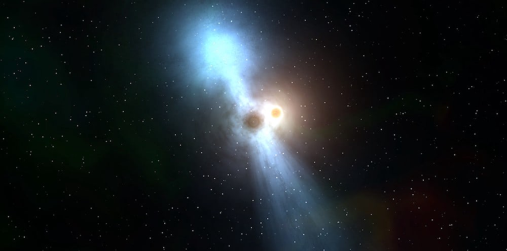 Figura 1. Representación artística del sistema binario formado por el púlsar PSR J2055+3829 y su estrella compañera, que está siendo vaporizada por la fuerte radiación de alta energía emitida por la estrella de neutrones (Michele Diodati/Universe Sandbox).