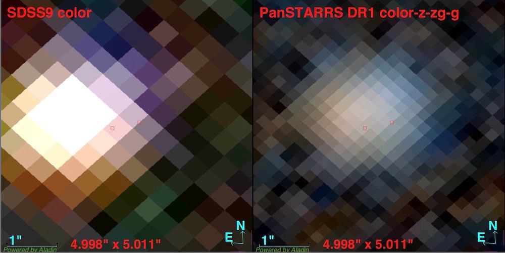 Tras inspeccionar las imágenes de archivo del Sloan Digital Sky Survey (SDSS) y el Panoramic Survey Telescope and Rapid Response System (Pan-STARRS1) nos percatamos de que en la posición del objeto podría haber dos fuentes distintas separadas por una fracción de segundo de arco (Fig. 4). Sin embargo, el Data Release 2 (DR2) de Gaia solo mostraba una fuente, pero el Early Data Release 3 (DR3) sí distinguía dos fuentes en la posición medida por el DR2 separadas por 0.5555 ± 0.0045 segundos de arco, de modo que surgió la idea de que podíamos haber encontrado un sistema triple. La fuente de Gaia con una solución astrométrica completa es la estrella subenana, que tiene un movimiento propio de 74.486 ± 1.769 milisegundos de arco por año.