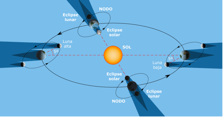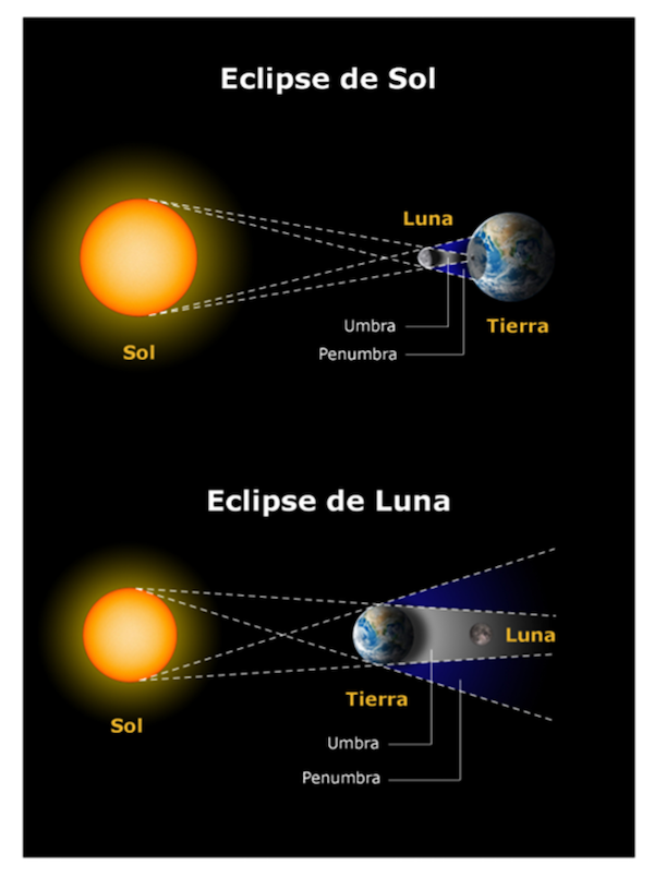 Los astros del sistema Tierra-Sol-Luna se mueven “casi” en el mismo plano, eso favorece que tengamos un eclipse de Sol cuando la Luna se interpone entre el Sol y la Tierra, y un eclipse de Luna, cuando es la Tierra la que proyecta su sombra sobre la Luna. En ambos casos pueden observarse variantes parciales o totales, y en el caso solar también la modalidad anular.