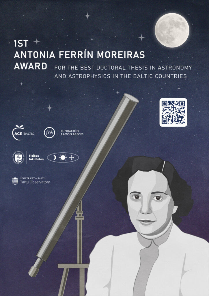 La Asociación de Científicos Españoles en los Países Bálticos (ACEBaltic) se complace en anunciar la Primera Edición del Premio “Antonia Ferrín Moreiras” a la Mejor Tesis Doctoral en Astronomía y Astrofísica (Países Bálticos). Este premio rinde homenaje al legado de la Dra. Antonia Ferrín Moreiras, pionera de la astronomía en España, y tiene como objetivo reconocer investigaciones doctorales de excelencia en este ámbito.